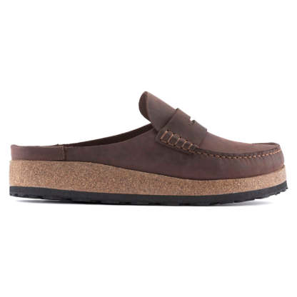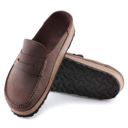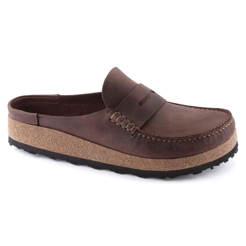 A new Birkenstock clog for men, Naples features classic moccasin style construction, a cushioning midsole and a rubber grip outsole for added traction and durability. The upper is made from thick, oiled nubuck leather.