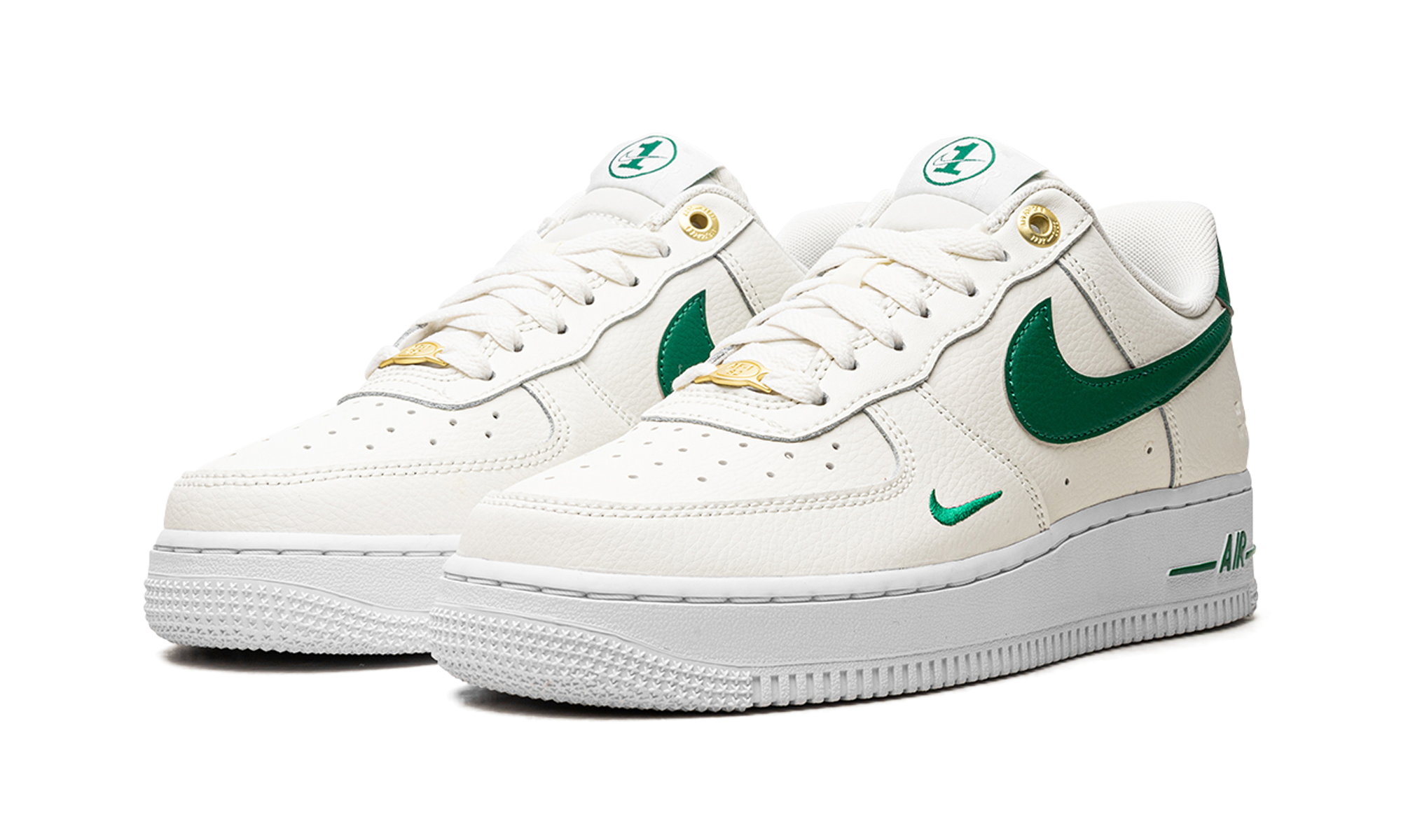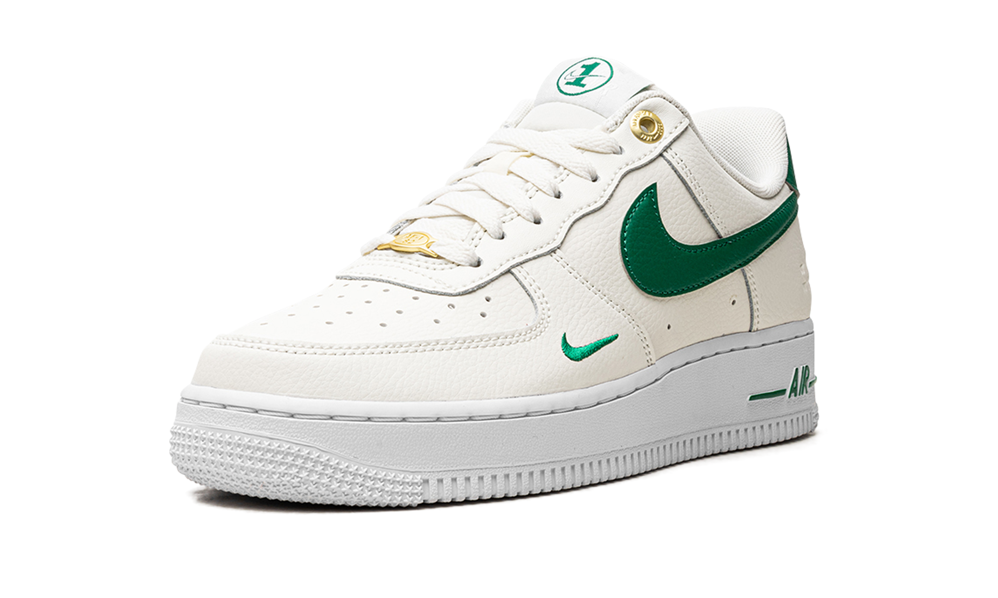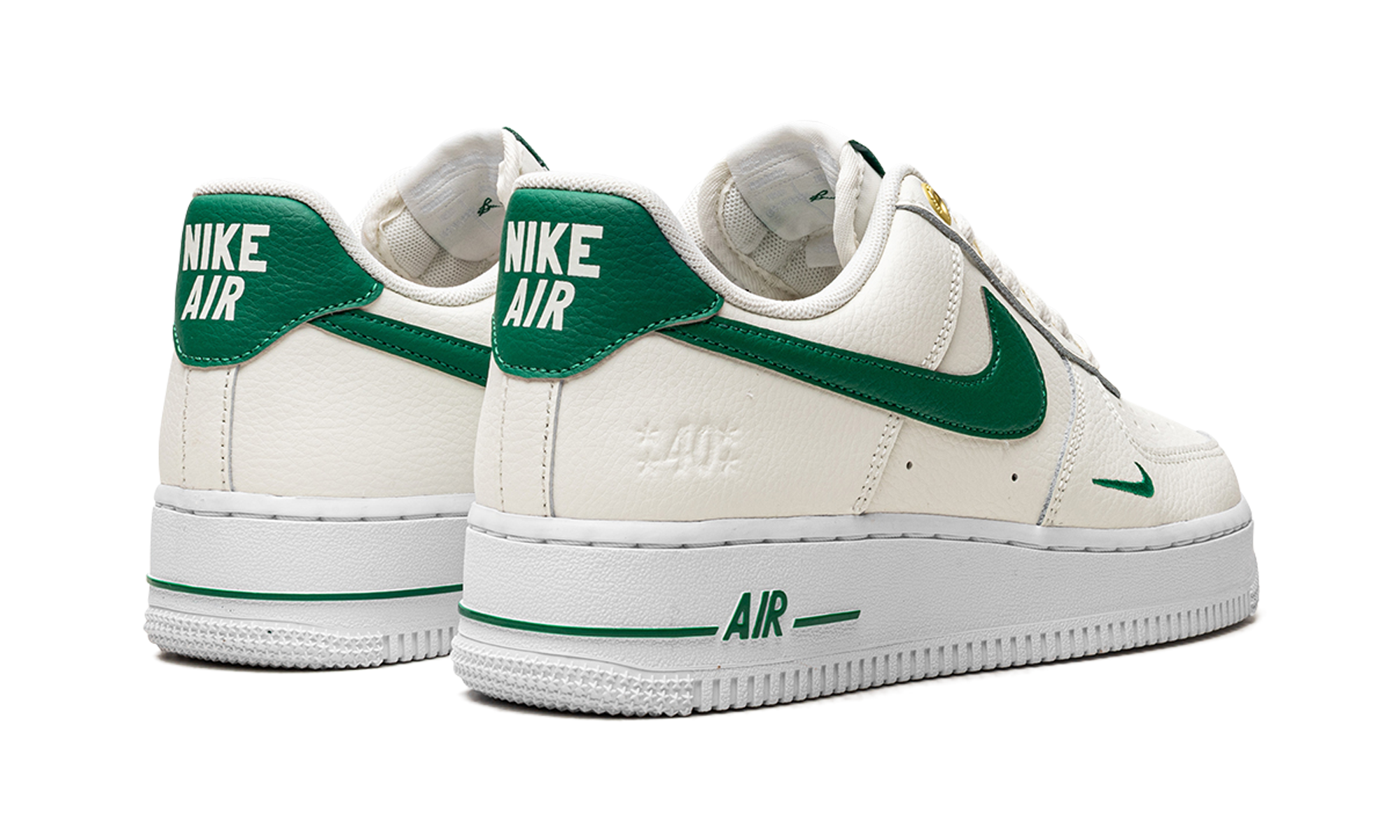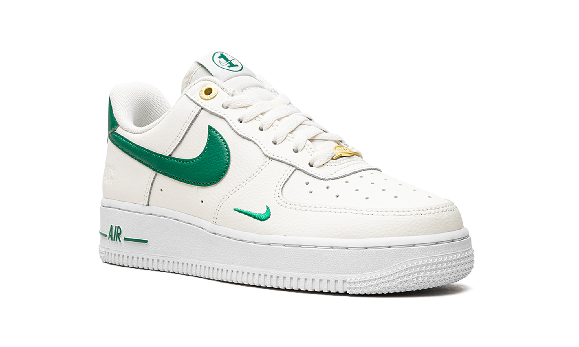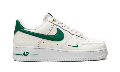 Nike Air Force 1 Low Malachite are o parte superioară din piele crem. Pe el găsim un mini Swoosh brodat în verde, care se potrivește cu clasicul Swoosh pe lateral, întărire pe călcâi, branding pe limbă și ornament verde pe talpa de cauciuc alb. Șiretul este înlocuit cu secțiuni aurii pe care scrie „AF-1 '82” pentru a se potrivi cu ochiurile care au fost reproiectate pentru ocazie.